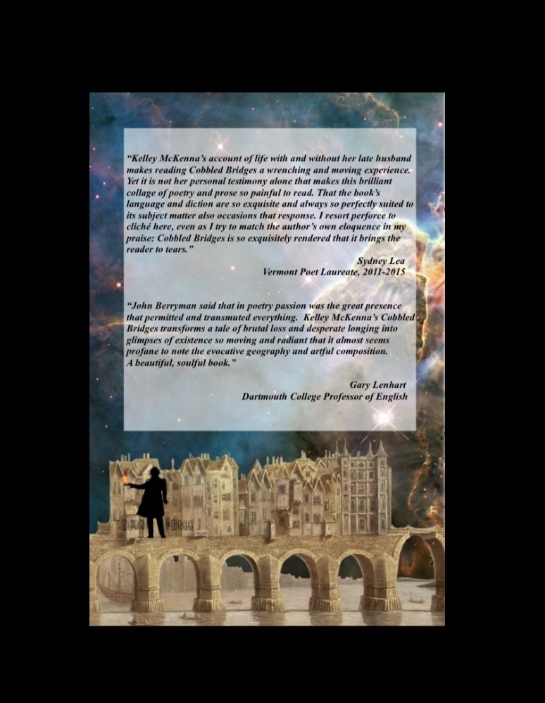 “Kelley McKenna’s account of life with and without her late husband makes reading Cobbled Bridges a wrenching and moving experience…the book’s language and diction are so exquisite and always so perfectly suited to its subject matter… I resort perforce to cliché here, even as I try to match the author’s own eloquence in my praise: Cobbled Bridges is so exquisitely rendered that it brings the reader to tears.” Sydney Lea, Vermont Poet Laureate, 2011-2015